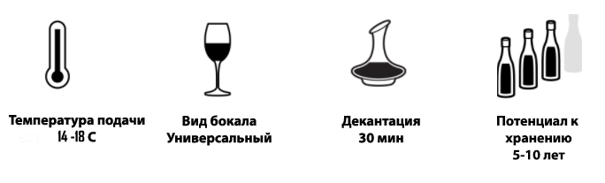 Такое вино обладает полнотелым сложным вкусом и длительным сроком старения. А также красивым тёмно-красным цветом с фиолетовыми оттенками.
