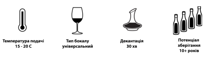 Вина мають насичений колір, з приємним легким присмаком, в якому відчуваються відтінки сливи, чорної смородини, білого перцю, ожини.